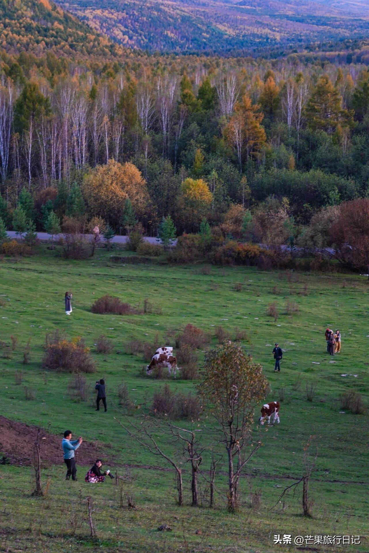 只见夕阳下万物披上金色的光芒,牛羊在草地上悠闲地吃草,远处的村庄炊烟袅袅,四周是五彩斑斓的森林,真的有一种与世隔绝时光停滞的感觉。
