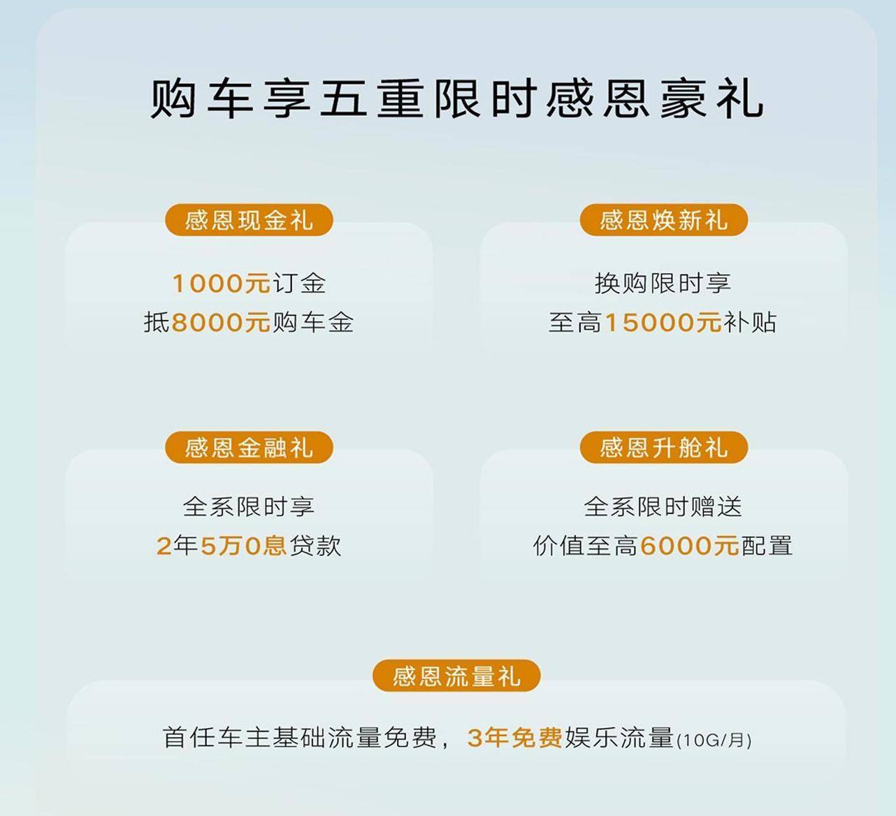 此外,全系车型提供2年5万0息金融方案,大幅缓解购车资金压力。赠送价值至高6000元配置升级,让入门车型也能享受高配体验。首任车主基础流量免费,并可享受10G/月的3年免费娱乐流量,确保智能座舱乐趣随时在线。